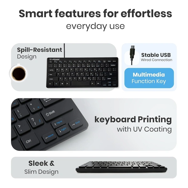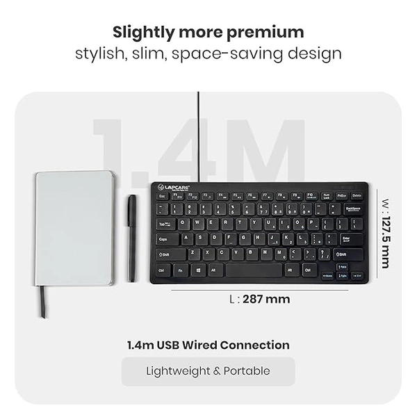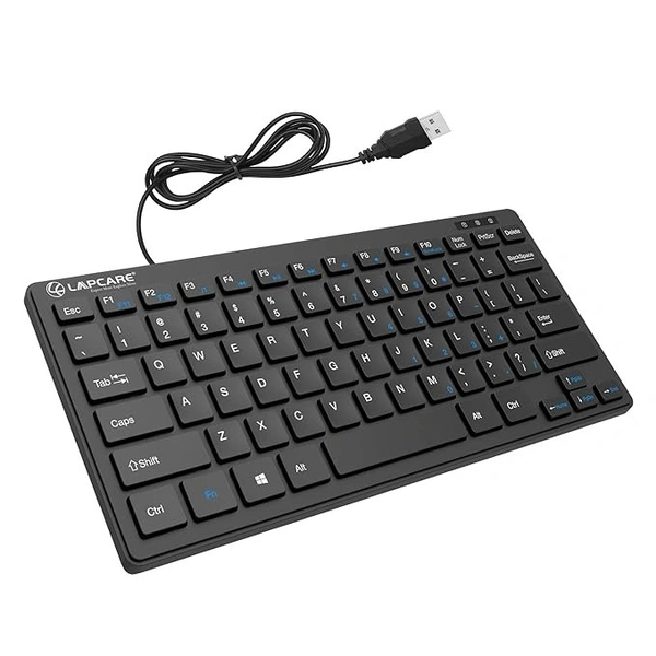 LAPCARE D-Lite Black Mini Wired Keyboard – 87 Key Compact USB Keyboard with Multimedia Fn Keys, Quiet Chocolate Keycaps, UV Coating, 8 Million Keystroke Life - Plug & Play for PC/Laptop (Black)