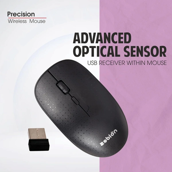 Zebion Precision 4G Wireless Mouse, USB Nano Receiver, Adjustable DPI 800/1000/1600, Automatic Sleep State, Transmission rang Upto 10M, Required for 2 AAA Batteries, Silent Switch, Black Color